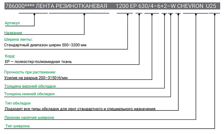Шевроны представляют собой выступы на поверхности ленты высотой до 35 мм. Форма и высота выступов зависит от типа шеврона. Лента имеет шевроны по всей длине полотна ленты, но ширина шеврона может отличаться от ширины ленты.