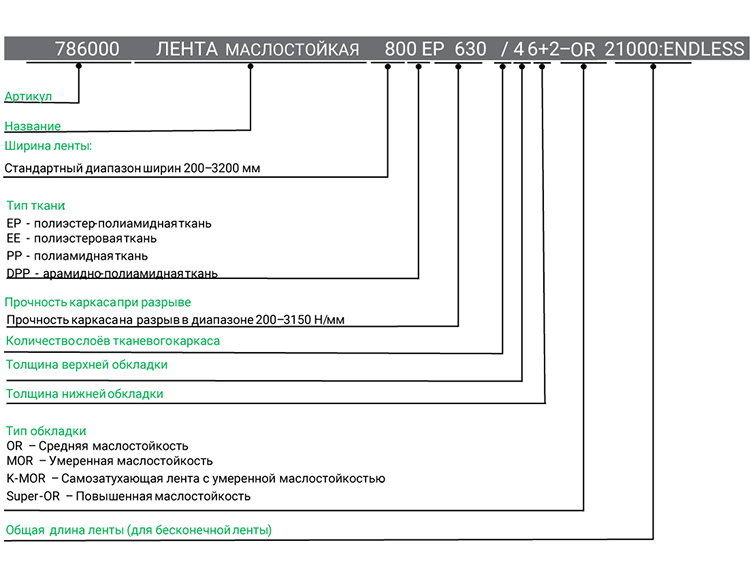 Конструкция ленты может содержать (защитную) брекерную прокладку с номинальной прочностью по основе от 40 Н/мм и по утку от 100 Н/мм или тканевую защитную прокладку с номинальной прочностью от 200 Н/мм по основе и утку. Так как масла и жиры по разному влияют на резину мы предлагаем различные типы резин для разных условий эксплуатации: OR, MOR, K-MOR, Super-OR.