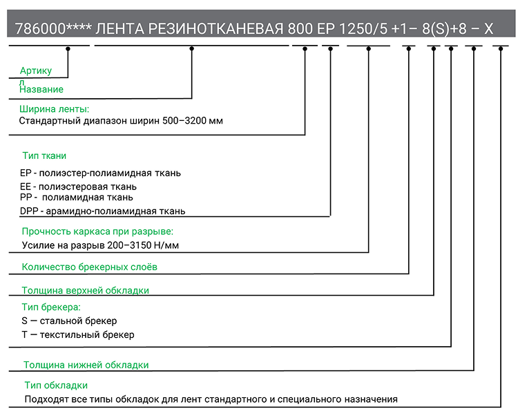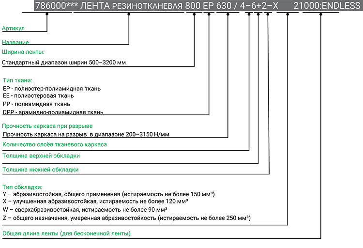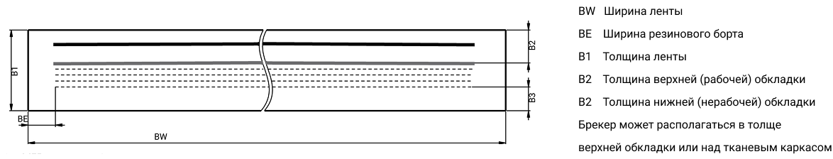 Конструкция ленты может содержать (защитную) брекерную прокладку с номинальной прочностью по основе от 40 Н/мм и по утку от 100 Н/мм или тканевую защитную прокладку с номинальной прочностью от 200 Н/мм по основе и утку. Типы резин, применяемых в лентах общего назначения, согласно (DIN 22102): Y, X, W, Z.